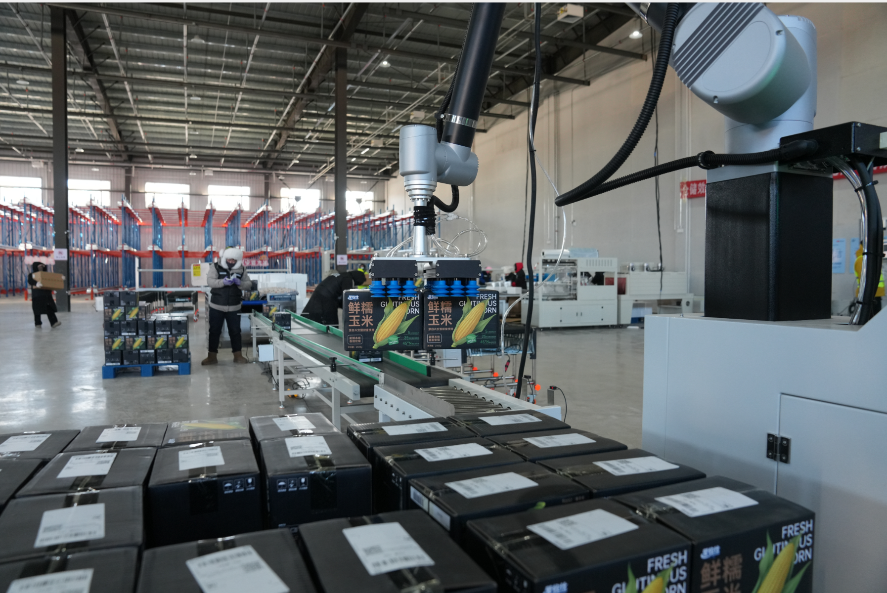 在興安盟扎賚特旗冷鏈物流園,自動機(jī)械臂正在搬運(yùn)貨物。